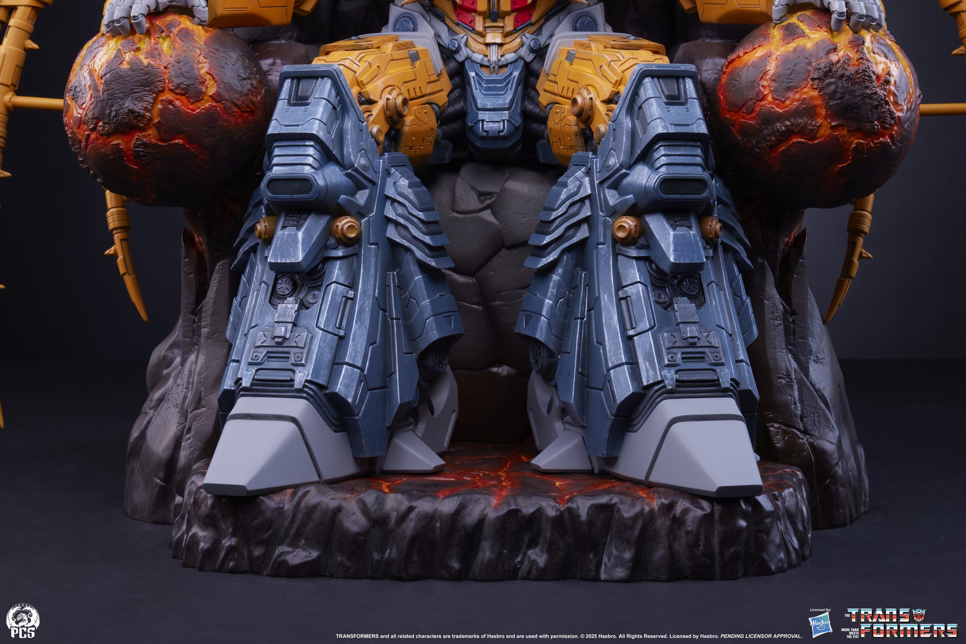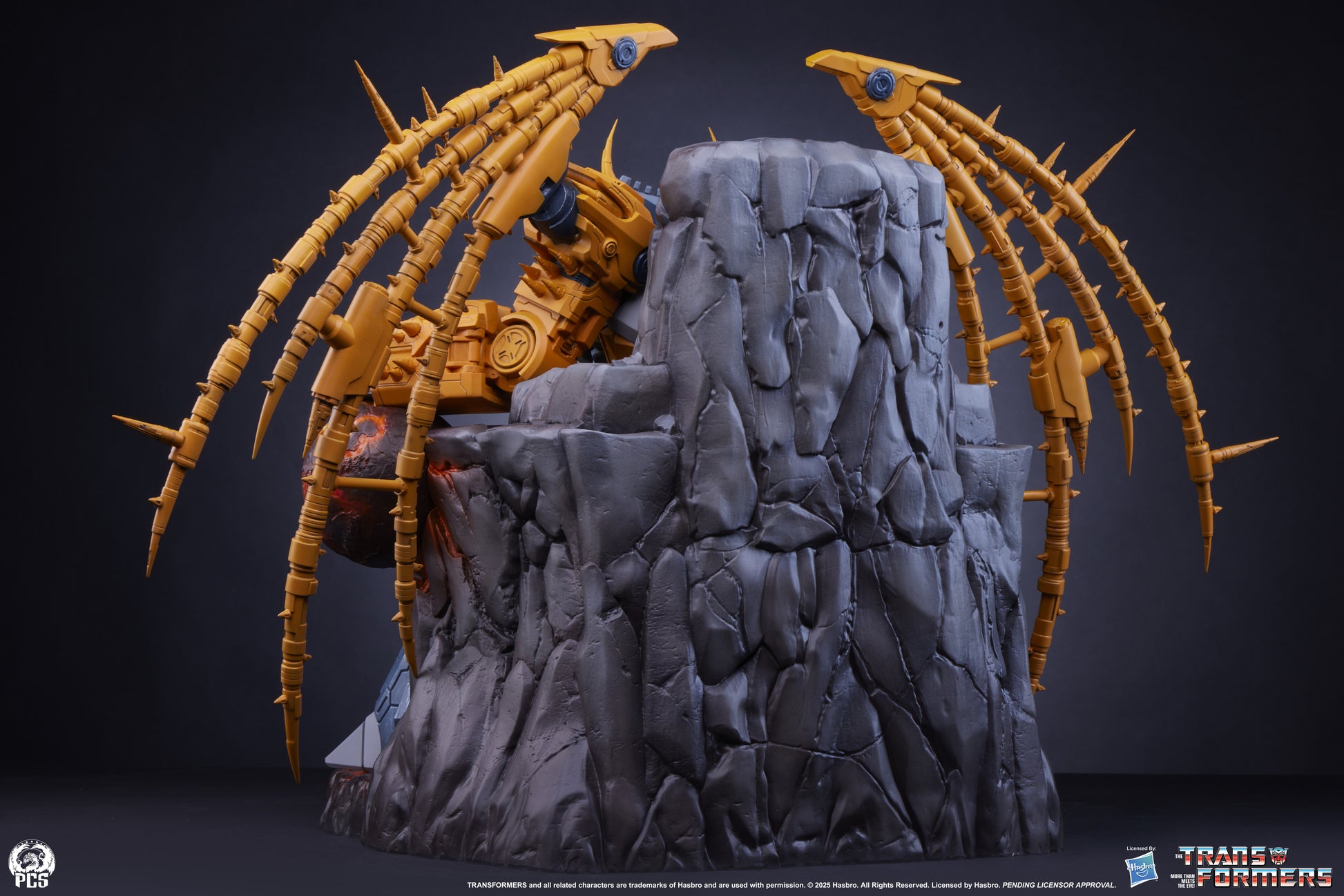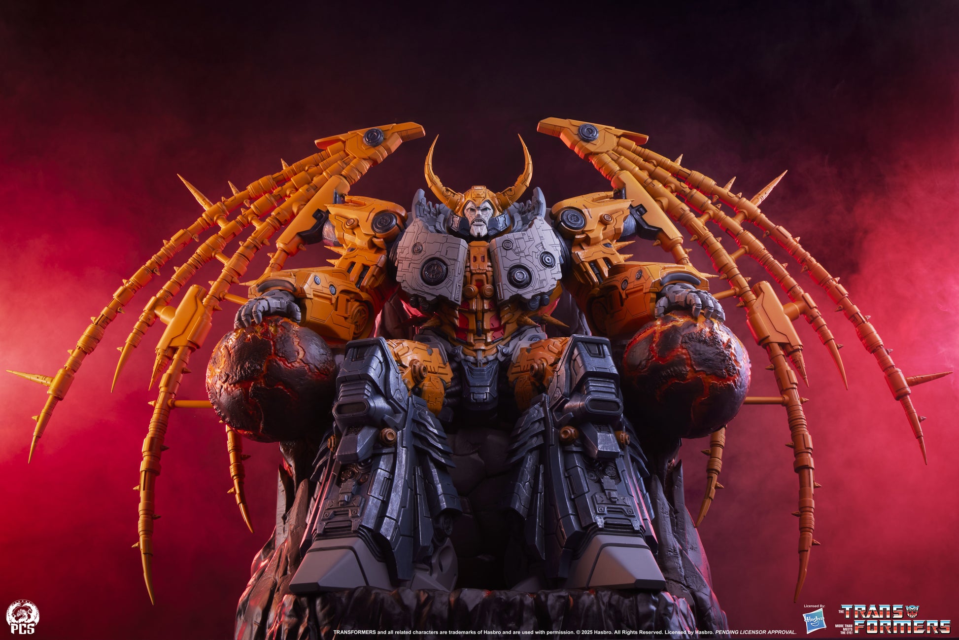 From PCS Collectibles. Premium Collectibles Studio is proud to present the Transformers - Unicron Museum Scale Statue, a massive and menacing rendition of this planet-sized Transformer. Unicron cuts an imposing figure measuring 24" tall sitting atop a throne that looks to have been carved into the side of an enormous asteroid. His 43.5" wingspan expands beyond his rough hewn throne only adding to his imposing presence. Every inch of this titanic Transformer is covered in intricate detailing such that the interlocking plates, rivets and alien technology appear ready to shift and change form into the robotic planet called Unicron. Unicron's classic color scheme of grays and yellows has been updated and refined adding a sense of realism that brings new life to this planet-eating Transformer. Additional weathering and highlights add even more depth to an already eye-popping deco application. The base for this Museum Scale statue is a jagged rocky throne, an interesting visual contrast to the steely mechanical appearance of Unicron. This titanic Transformer's incredible power is on display as he effortlessly crushes the two planets in his hands, spilling their molten cores onto his makeshift throne. Give in to the gravitational pull of this G1 giant and add the Transformers - Unicron Museum Scale Statue to your collection today!