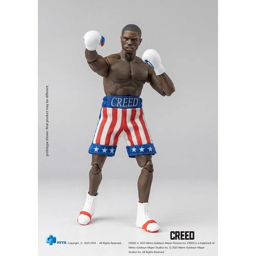 This 1:12 scale action figure stands 6 1/3-inches tall and faithfully recreates Adonis's iconic appearance from the film.Featuring a serious expression and sculpted muscular physique, the figure wears star-spangled boxing trunks, paired with modern sneakers and white athletic socks - echoing the legacy of his father. The design blends classic symbolism with contemporary style, capturing Adonis's identity as both a tribute and a new champion.