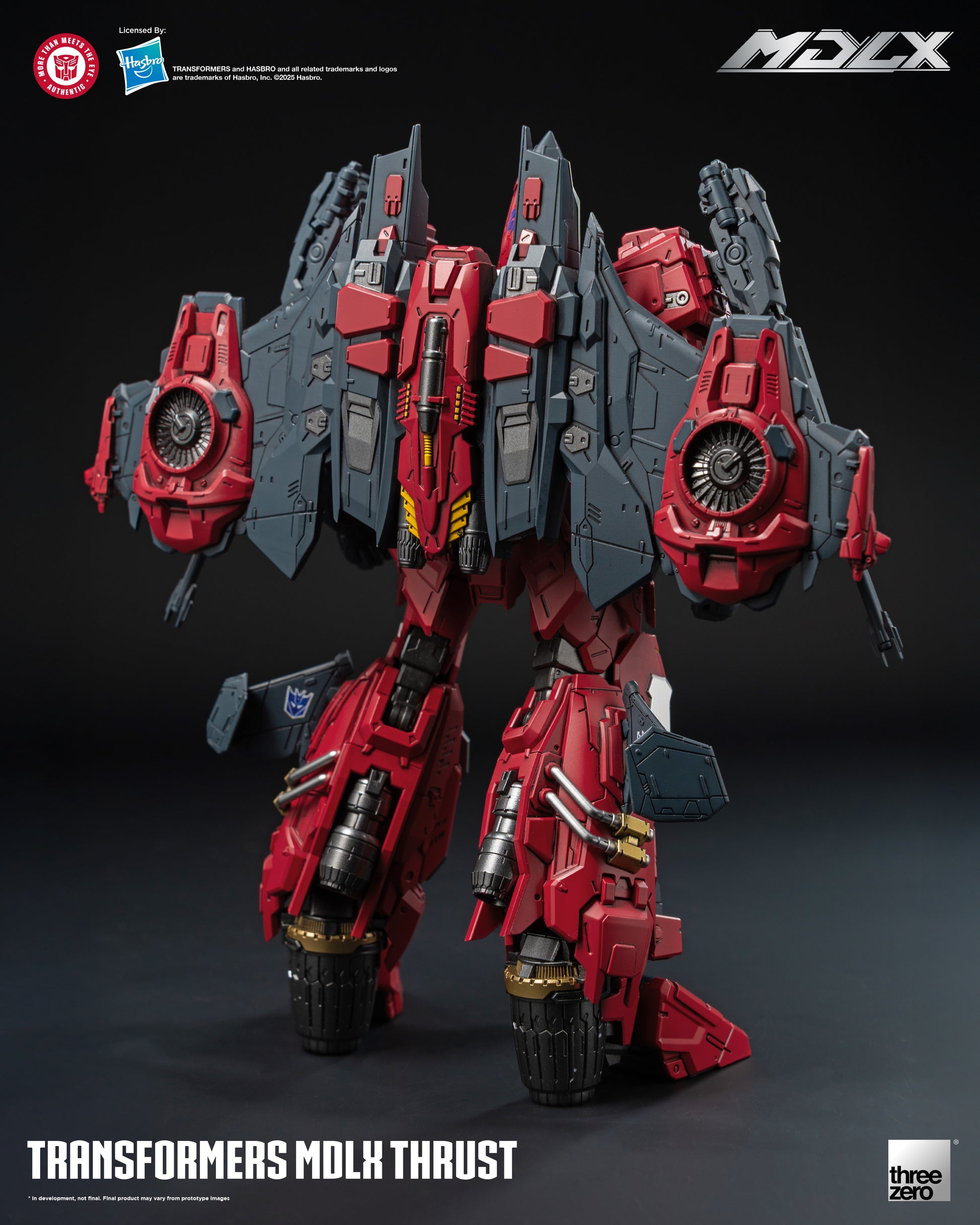 threezero Art Director Kelvin Sau redesigned this Decepticon Seeker Warrior to feature hyper-detailed mechanical aesthetic while mainting the character's iconic look. MDLX Thrust showcases a new head sculpt, paint applications, and panel lining. This figure uses threezero's unique die-cast zinc alloy and engineer-grade plastic frame system, enhancing the figure's tactile playability and durability. Like MDLX Dirge, MDLX Thrust will feature a modified foot design to achieve a more G1-inspired appearance.